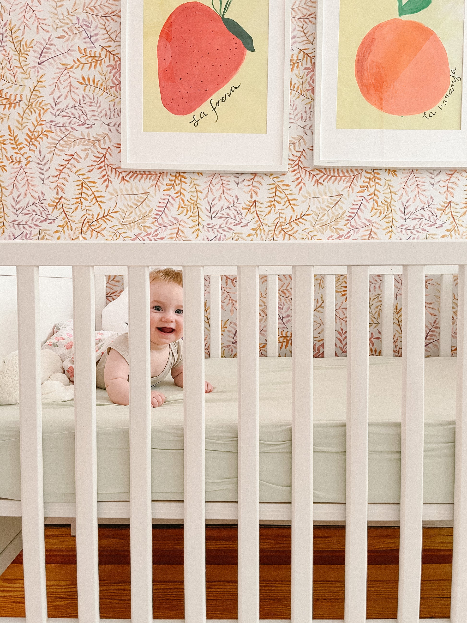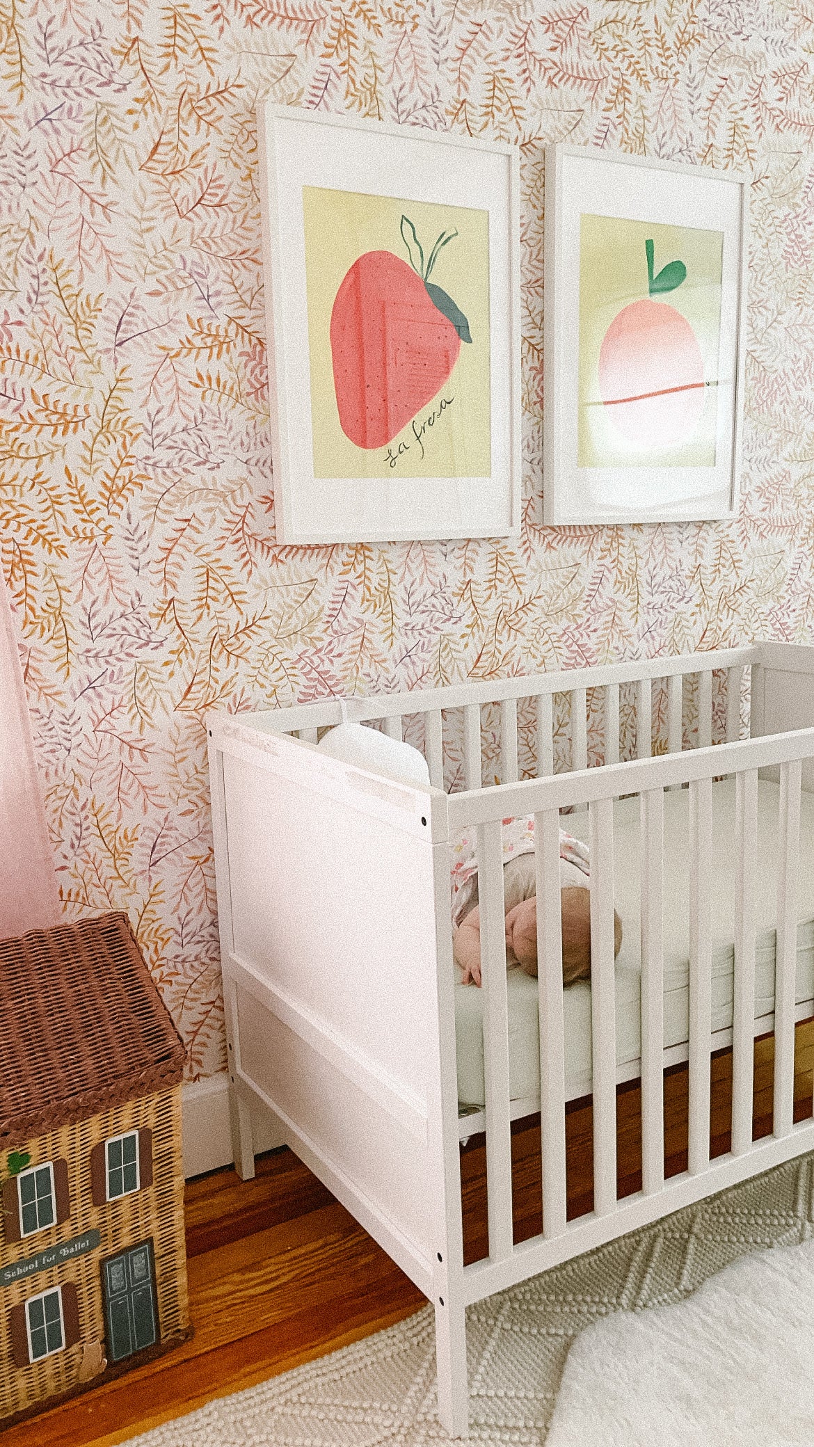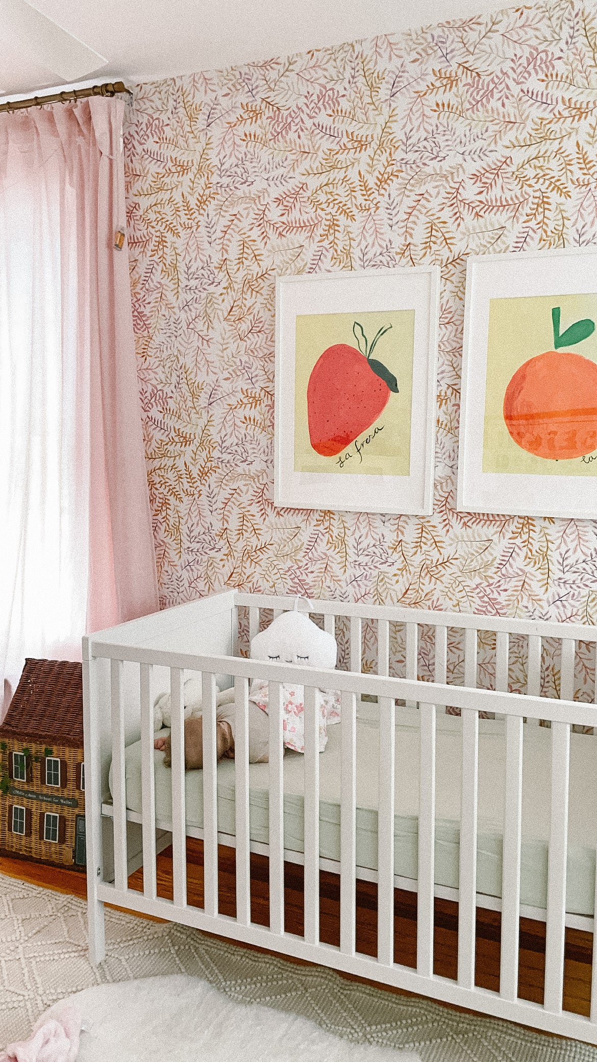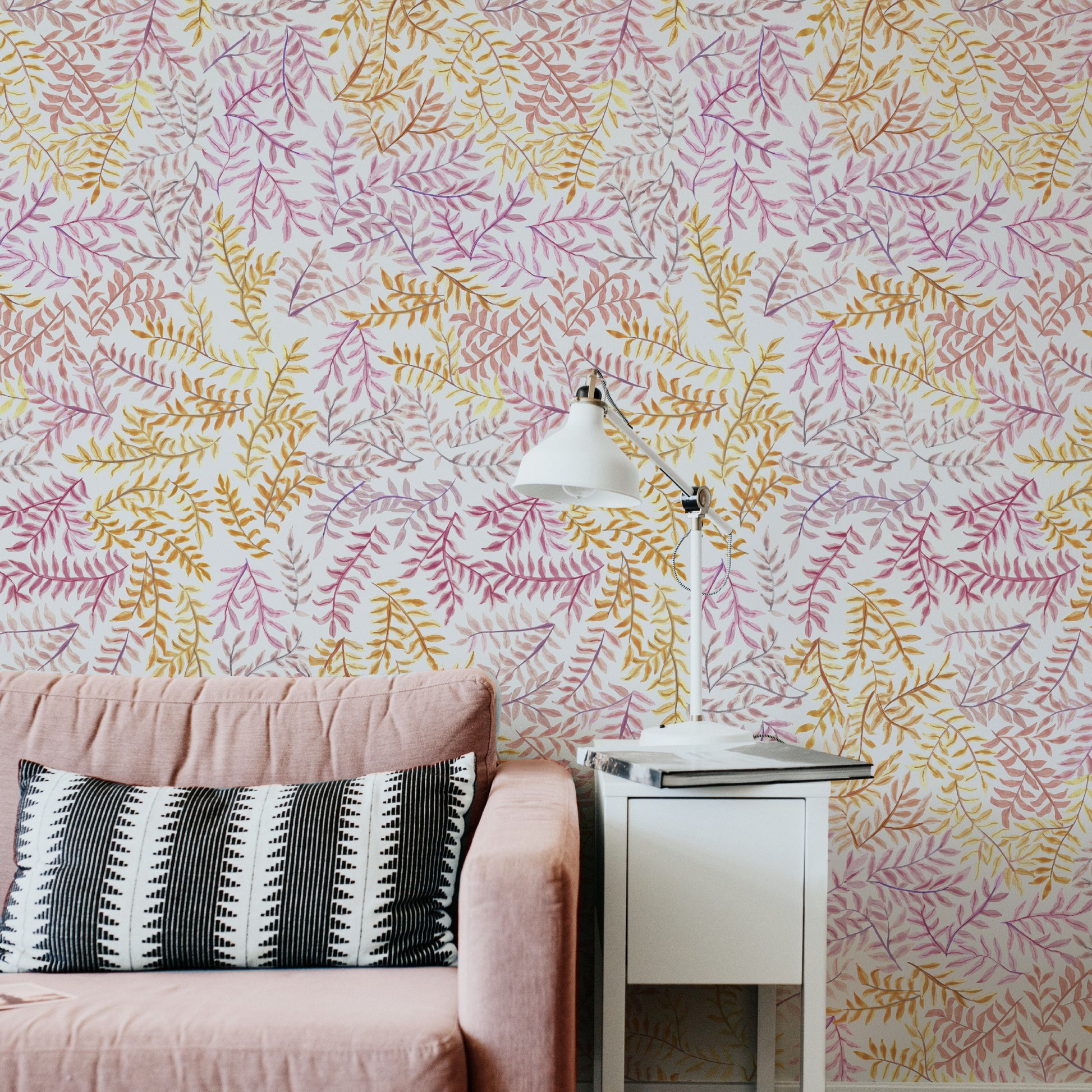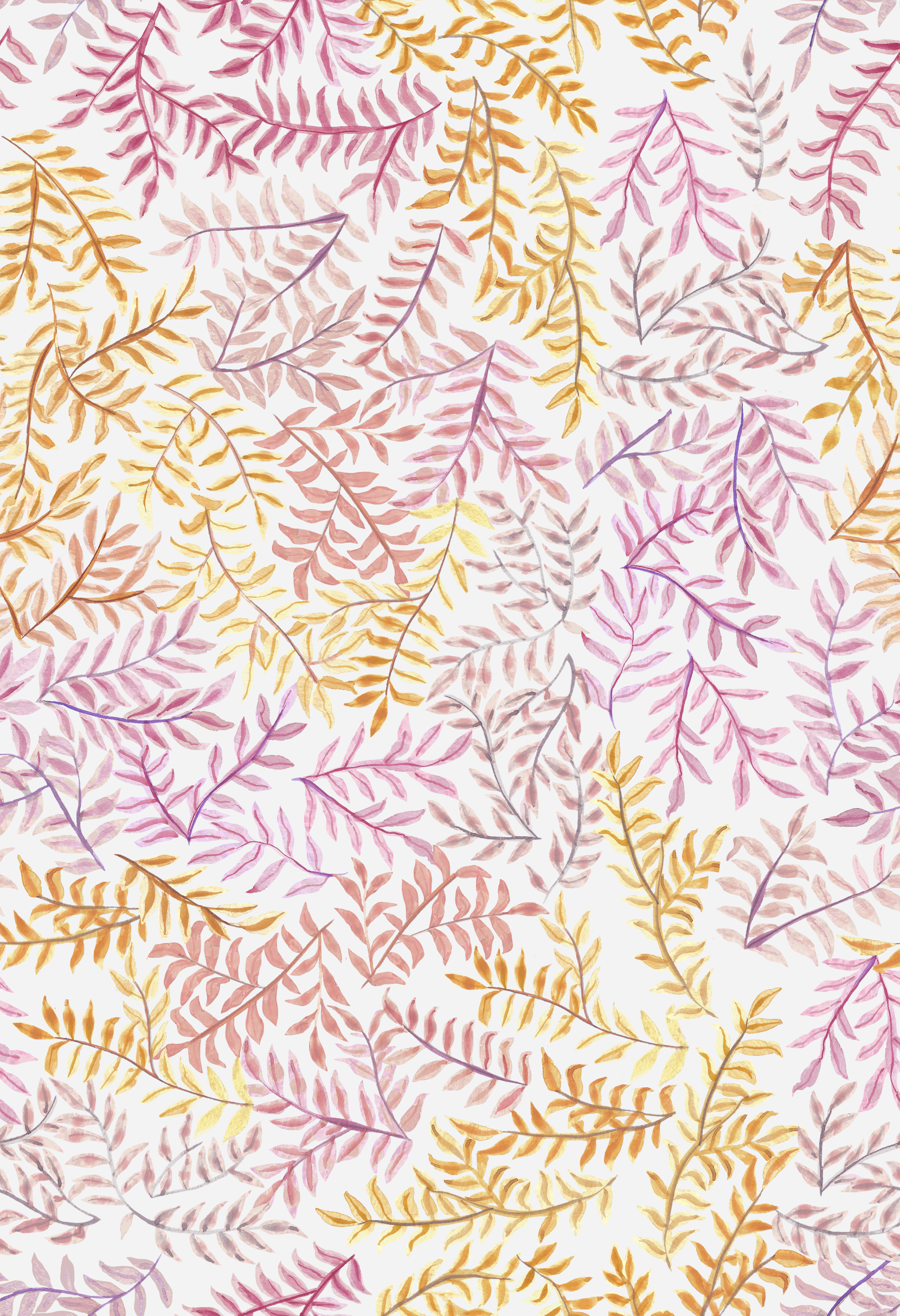 Hand-drawn swirling leafs in this busy pattern that mixes a classic design with contemporary colors: pinks, yellows and oranges.
