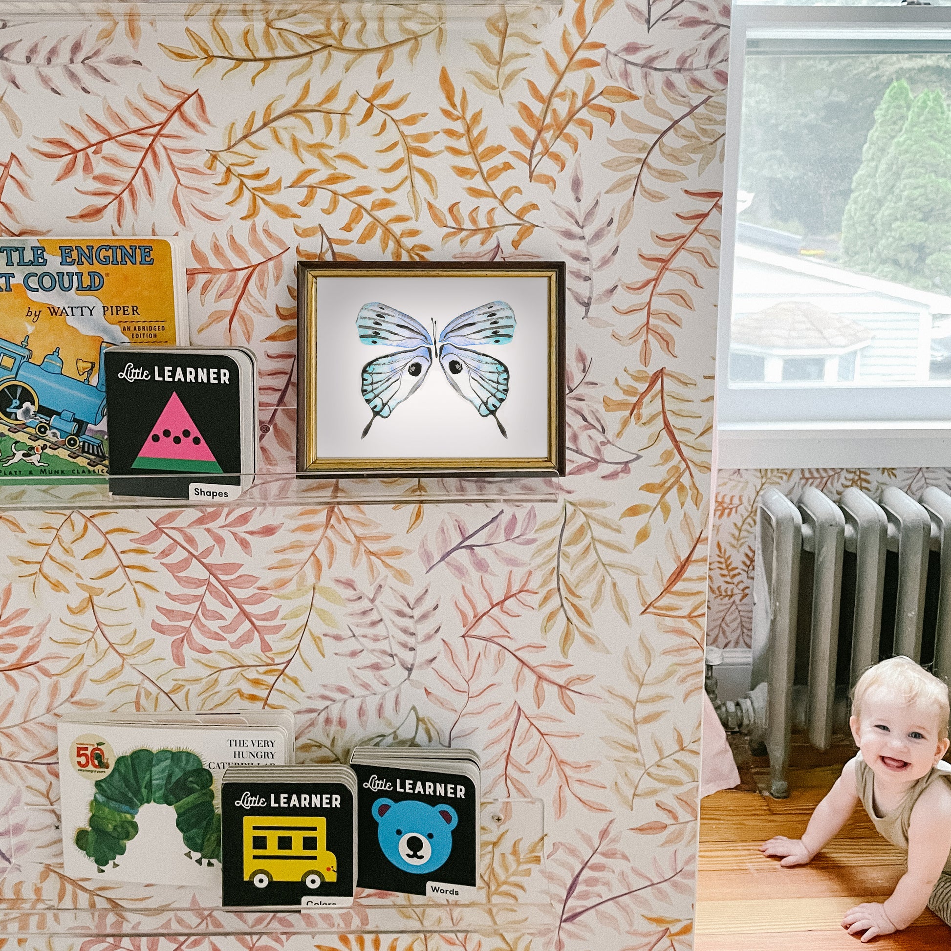 Watercolor butterflies, the original painting was created in March of 2020 while on maternity leave after welcoming our daughter Camila. In the picture, you can see the Blue Butterfly 5x7" greeting you into her bedroom.