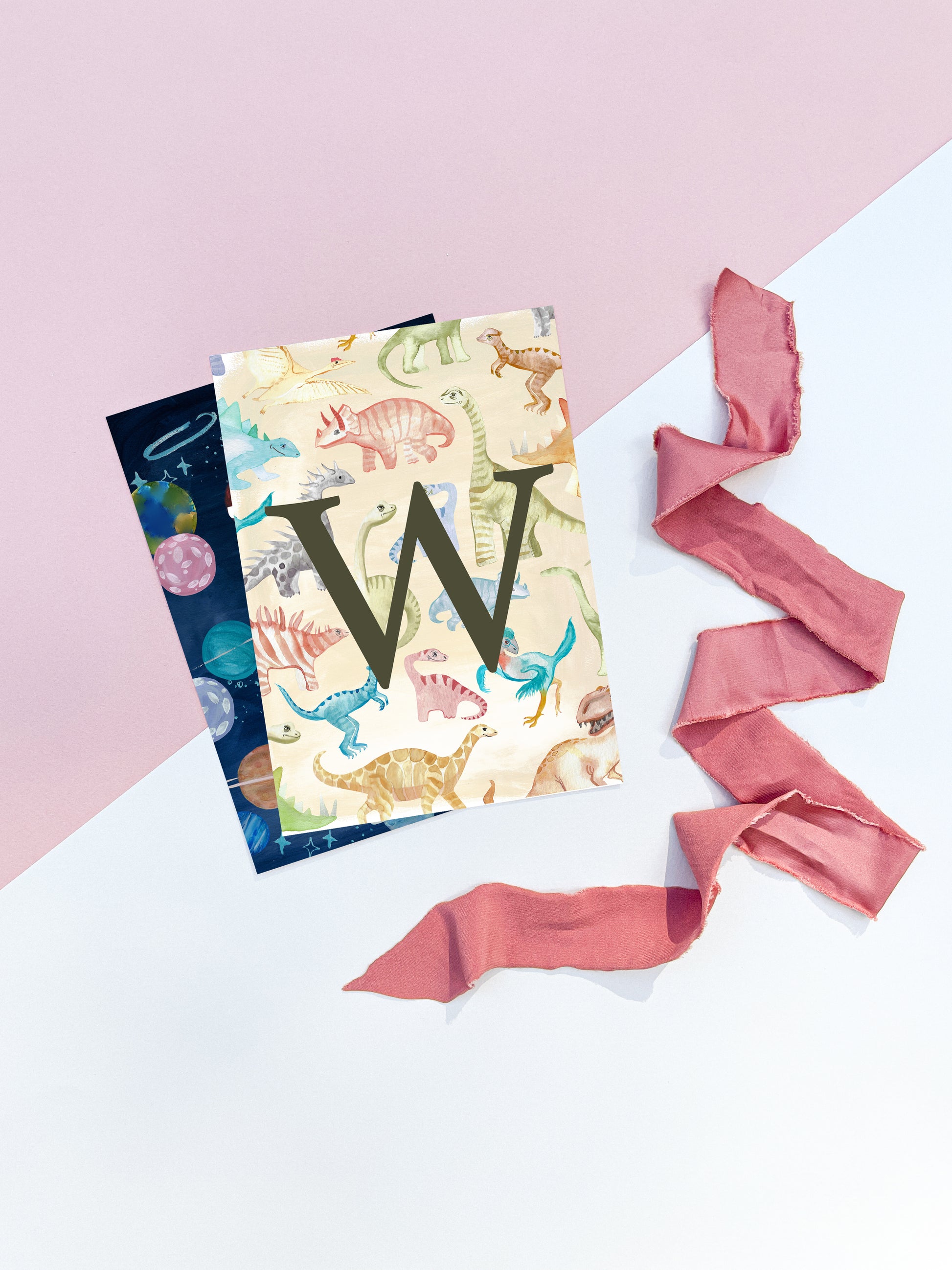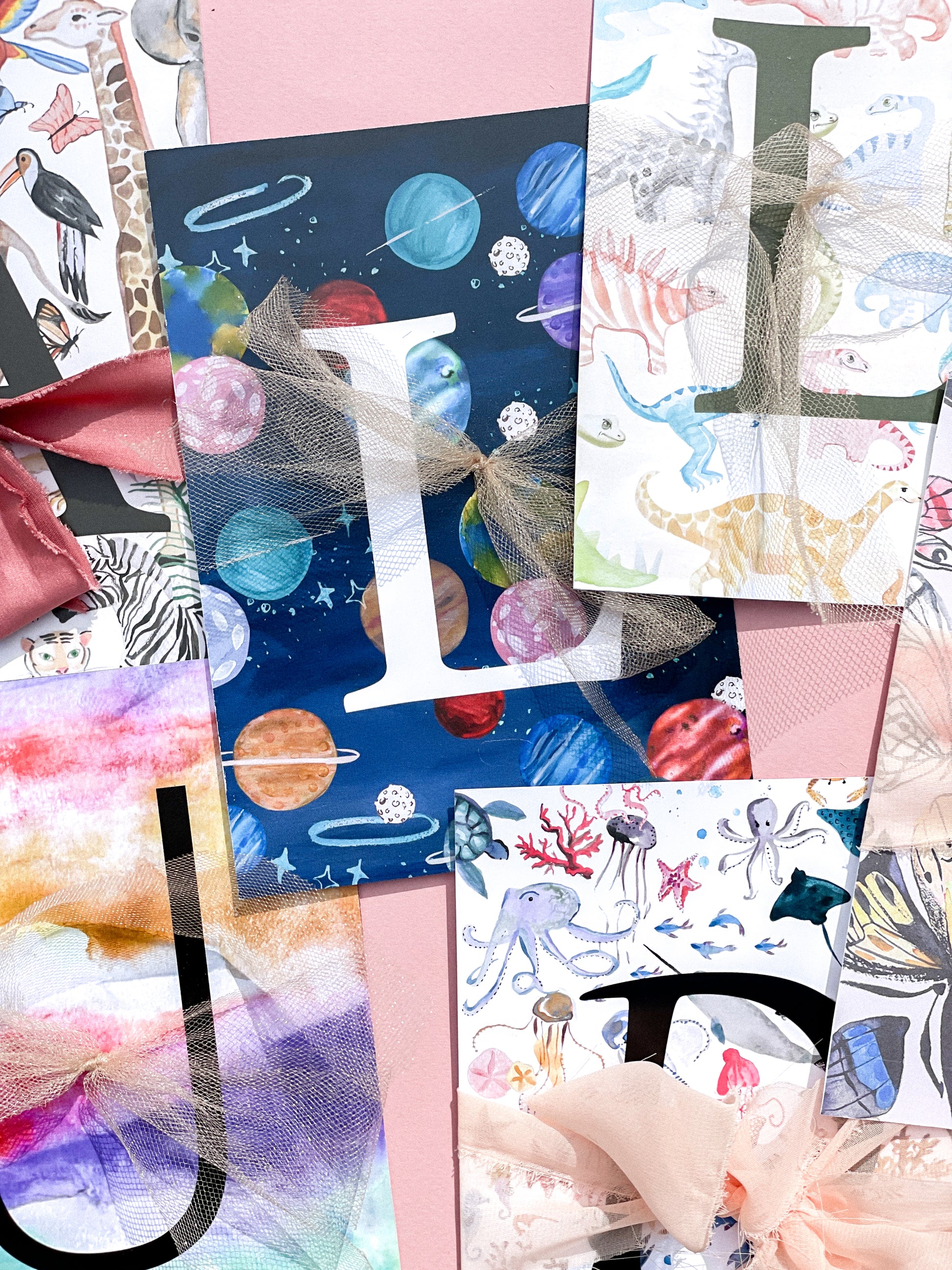 Full A to Z set with five mixed themes: Butterflies, Dinosaurs, Space/Planets, Tie Dye and Jungle themes.