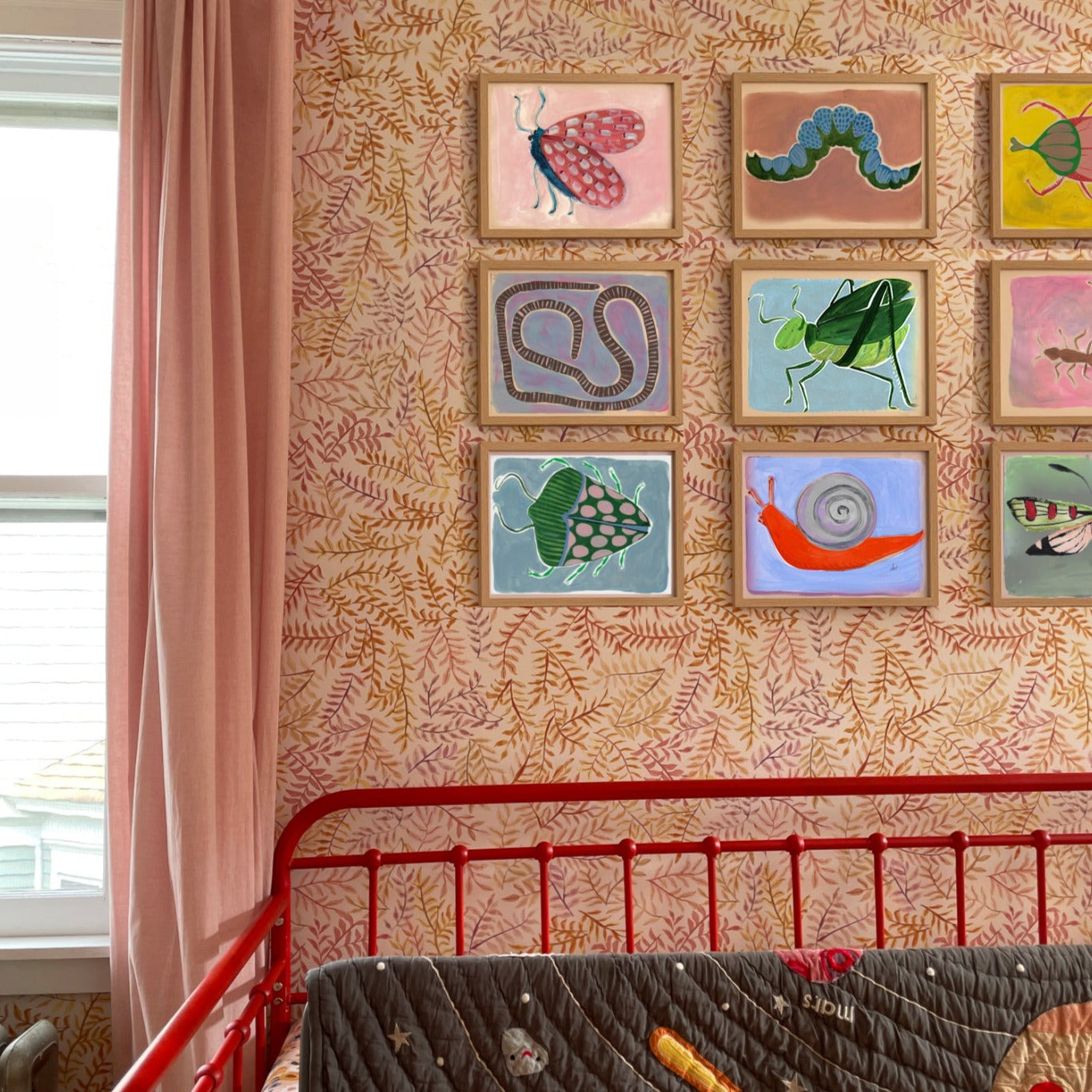 What I love about it: Perfect for a Bug Kids Room or Insect Nursery Themes, or a quirky playroom, this funky gallery wall featuring a beetle, a grasshopper, a worm, a snail, a caterpillar and a moth are in to bring a good time. The colorful brushstrokes over the beige background make it easy to blend in with a mid-century modern decor.