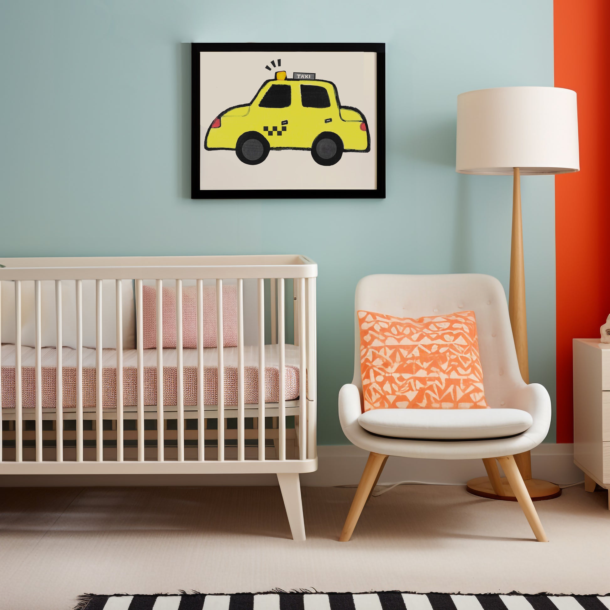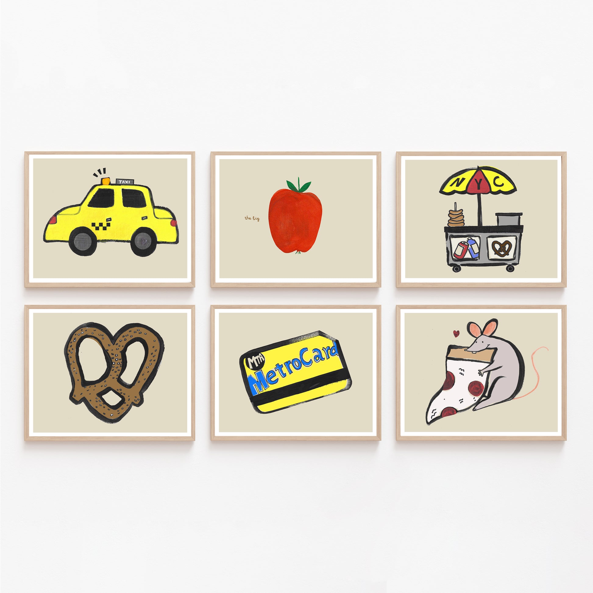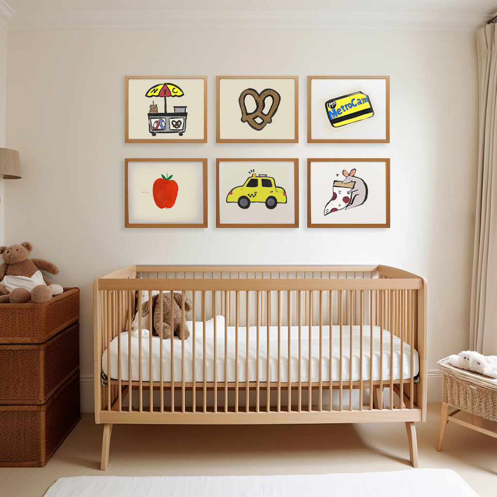 Perfect for a NYC Kids Room or New York Nursery Themes, or a quirky playroom, this funky gallery wall featuring the classic NYC Yankees Pigeon, a Hot Dog Cart, a Metro Card, a Pretzel, a yellow cab and a (big) apple. All NYC staples!