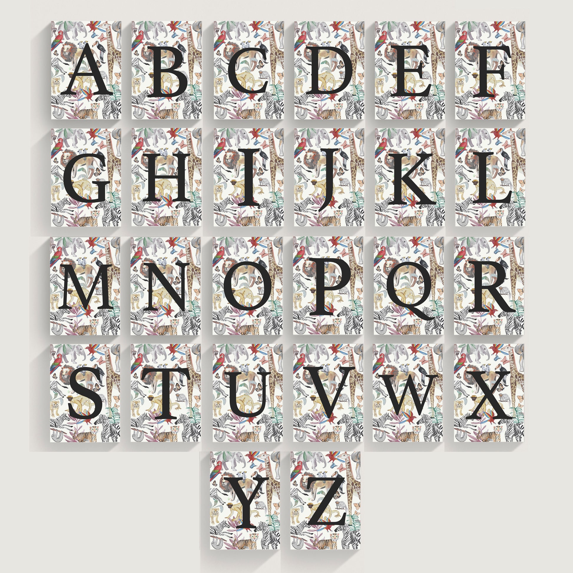 Full A to Z set with five mixed themes: Butterflies, Dinosaurs, Space/Planets, Tie Dye and Jungle themes.