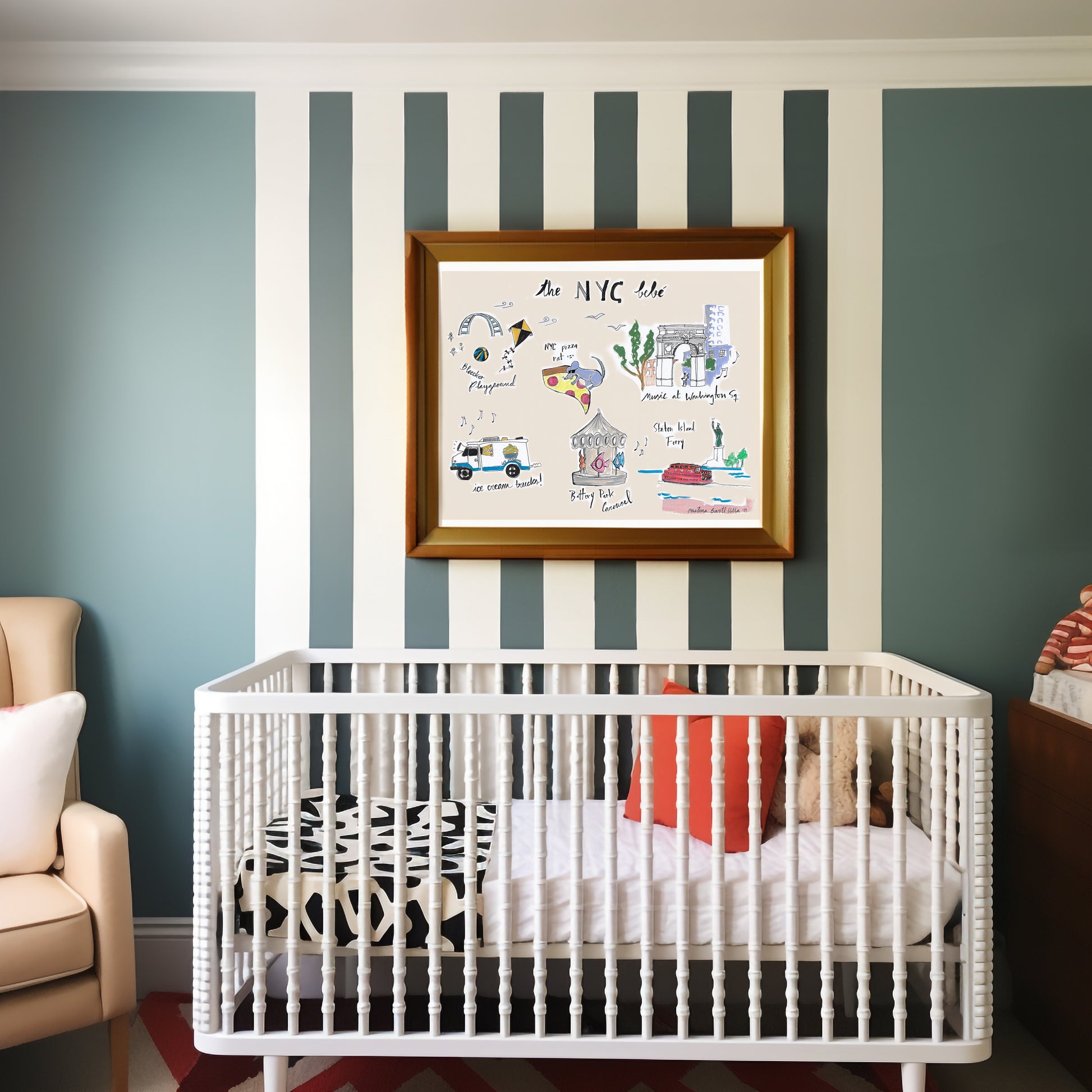 NYC nursery art, New York City kids room decor, whimsical toddler wall art, baby room NYC theme, NYC baby gift, gender neutral nursery decor, illustrated NYC poster, New York playroom art, urban nursery print, city themed wall art for kids, baby shower gift NYC, playful New York artwork