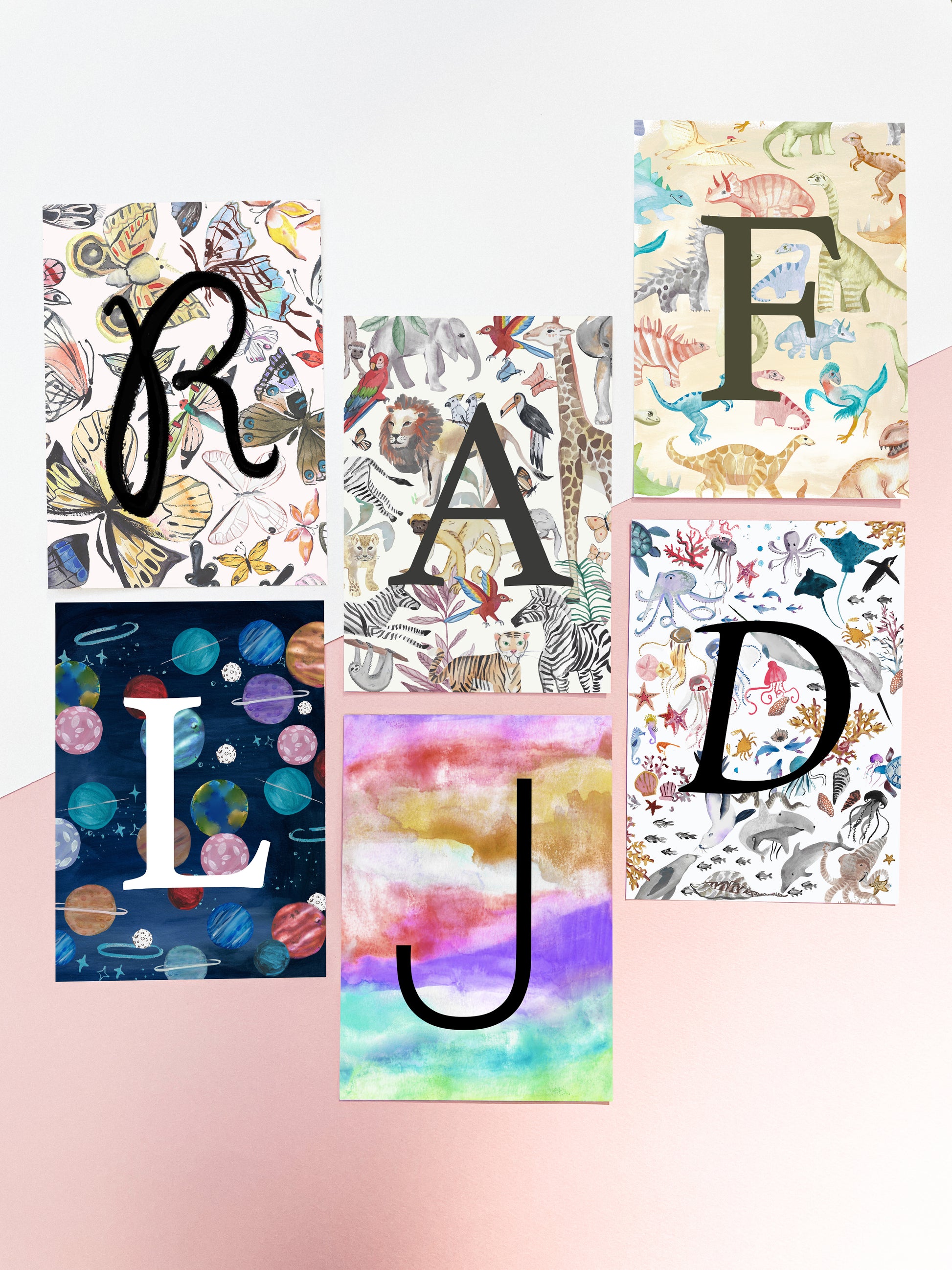 Full A to Z set with five mixed themes: Butterflies, Dinosaurs, Space/Planets, Tie Dye and Jungle themes.