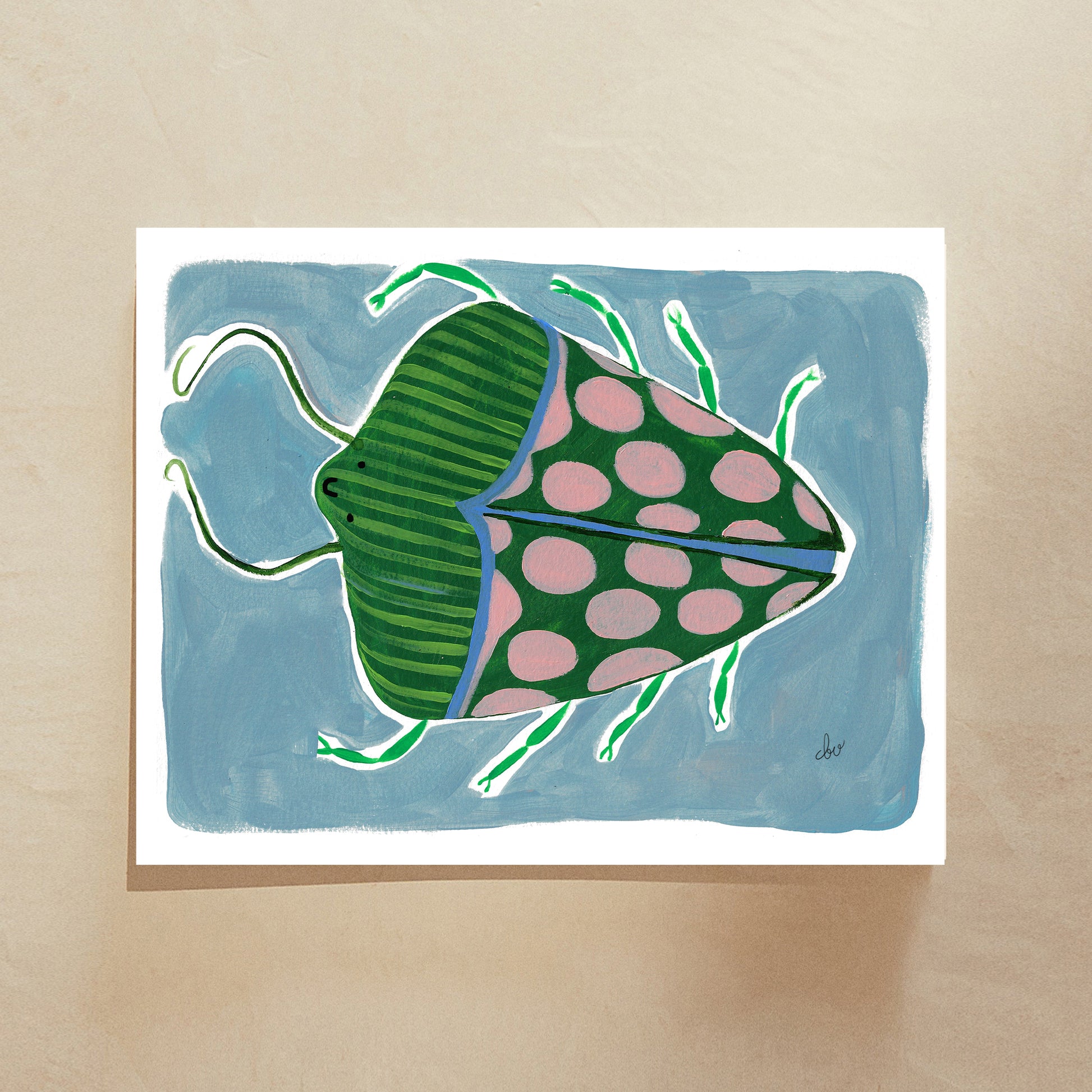 Title: "Stink Bug" originally painted in my home studio in Summit, New Jersey. Hand painted using watercolors and gouache on archival watercolor paper.