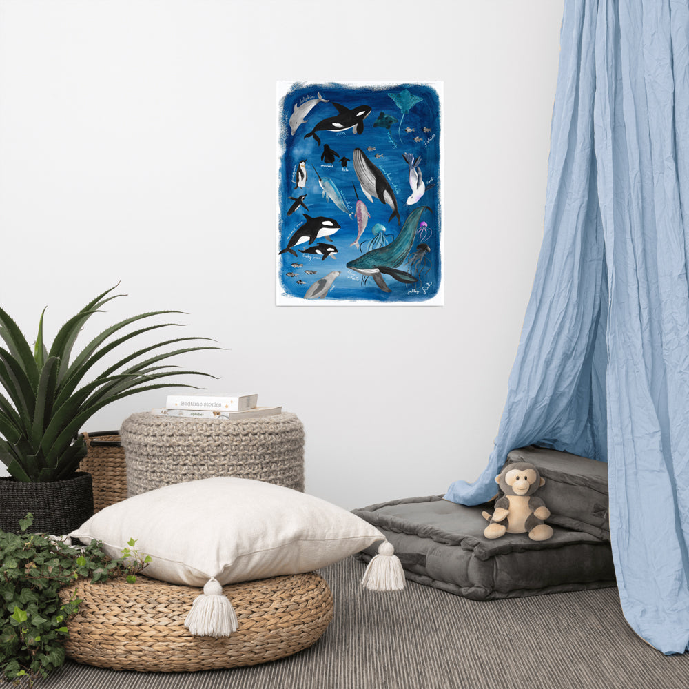 Take a peek under the sea with this illustration of all the underwater fun including blue whales, orcas, seals, penguins and even a couple narwhals. This is a print of an original watercolor that I hand painted in April of 2021 (you can see all the work behind the scenes on my Instagram)